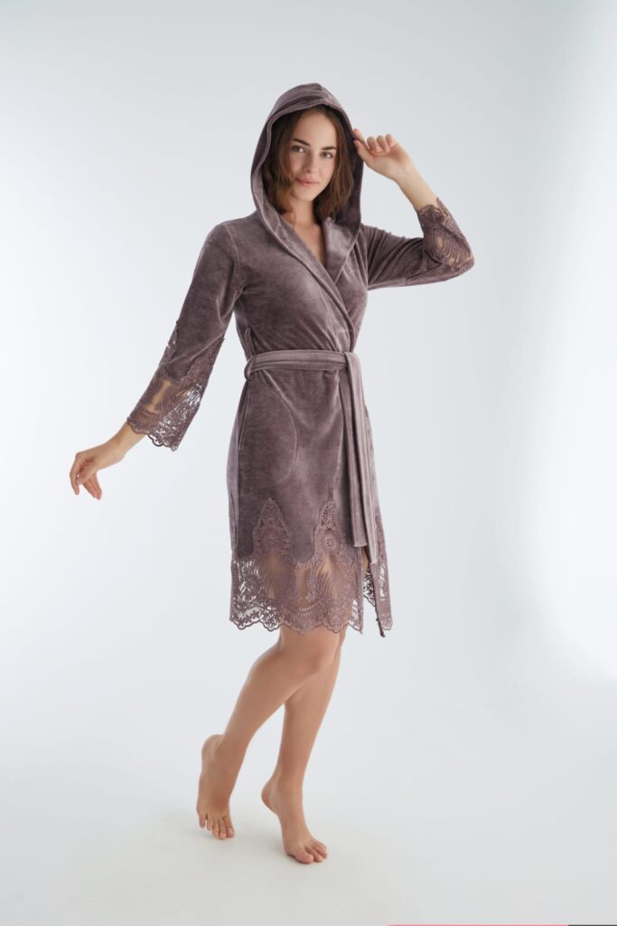 Велюрові халати – м’який натуральний матеріал, поверхня якого складається з безлічі ворсинок. Їхня довжина в залежності від виду велюру може бути різною, в межах від трьох до семи міліметрів. Ворс розташований на тканині щільним шаром, що визначає, наскільки виріб з велюру буде бархатистим і ніжним на дотик.